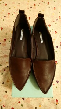 --咖啡色尖頭平底鞋。鞋子的材質是真皮,剪裁和縫線很簡潔,穿起來柔軟舒適、透氣親膚、不咬腳;鞋子整體造型簡單俐落,散發出時尚品味 ;深棕大地色系,看起來自然,容易搭配衣物;最喜歡它是平底鞋,是最耐穿最實穿最好穿的鞋款。能有一雙又美又好穿的鞋子,穿著它趴趴走,是多麼幸福啊