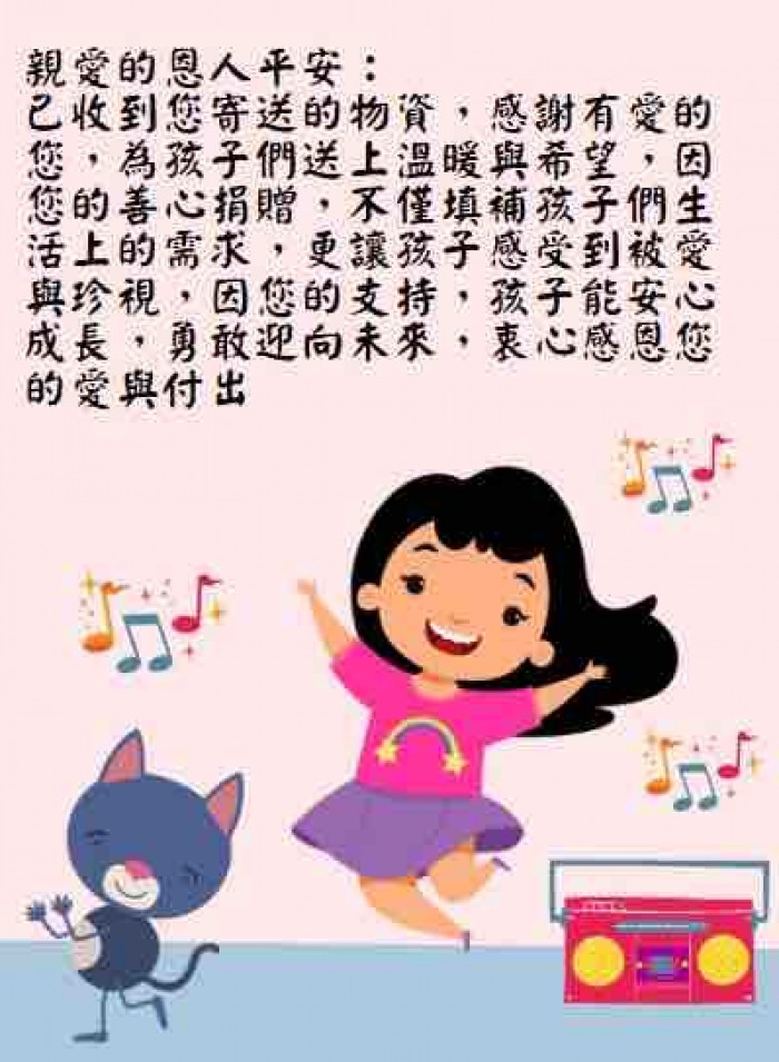 親愛的恩人朋友們平安,感謝您在新的一年持續關注特殊需求孩子,您寄送的物資已收到,非常感恩