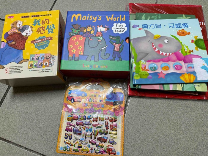 書本都很棒呢!有厚頁操作書、繪本,很適合家中二寶跟三寶,剛收到時女兒們就迫不及待拿了幾本來看,還有可愛的車子貼紙及野餐墊,真的是一箱滿滿的禮物