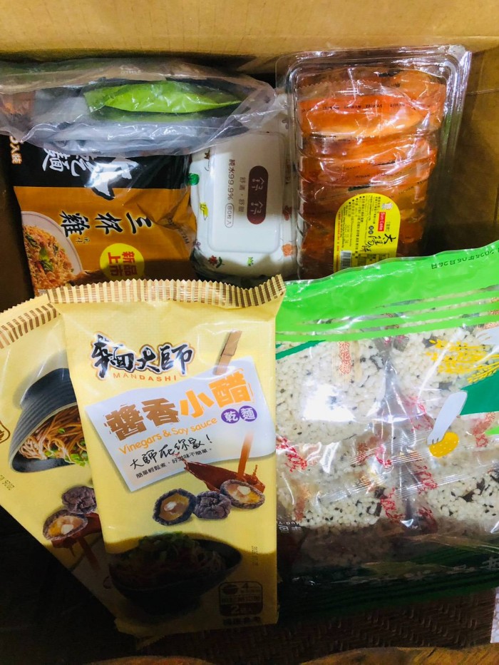 泡麵等,餅乾,太陽餅等,濕紙巾五包等等;