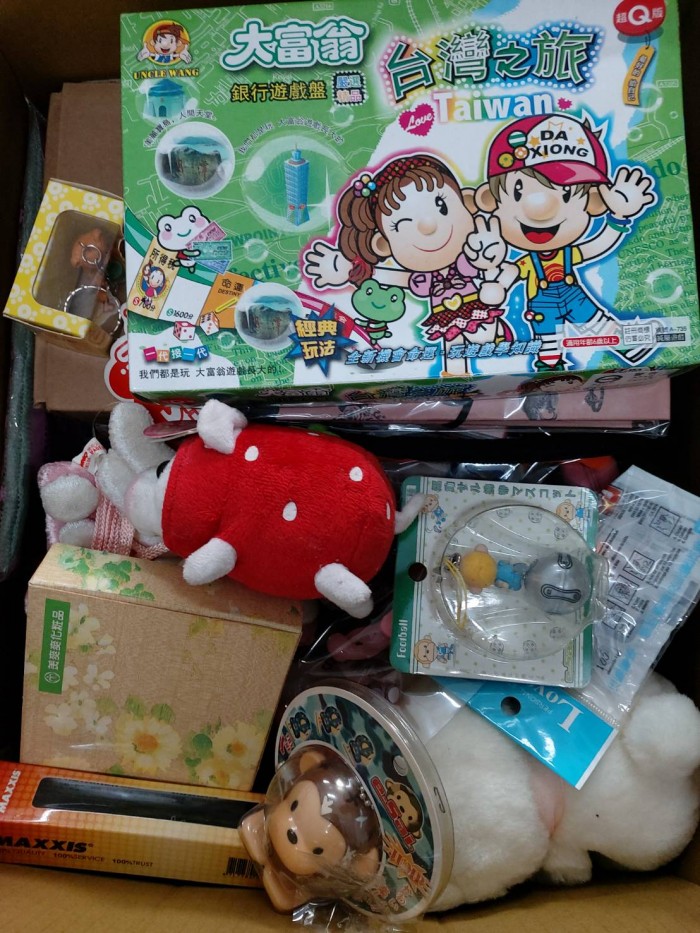 裝箱寄出,內含文具/玩具/包包/廚房用品/帽子等,新舊皆含,謝謝您。