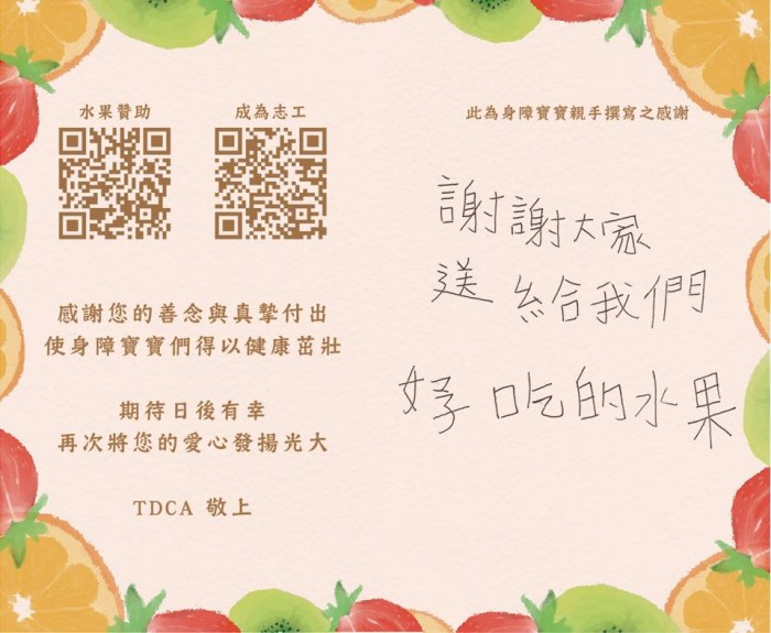 另外,也歡迎您臉書搜尋粉絲專頁「身障寶寶.希望水果 關愛陪伴計畫」,看更多我們的動態或留下您的鼓勵喔~