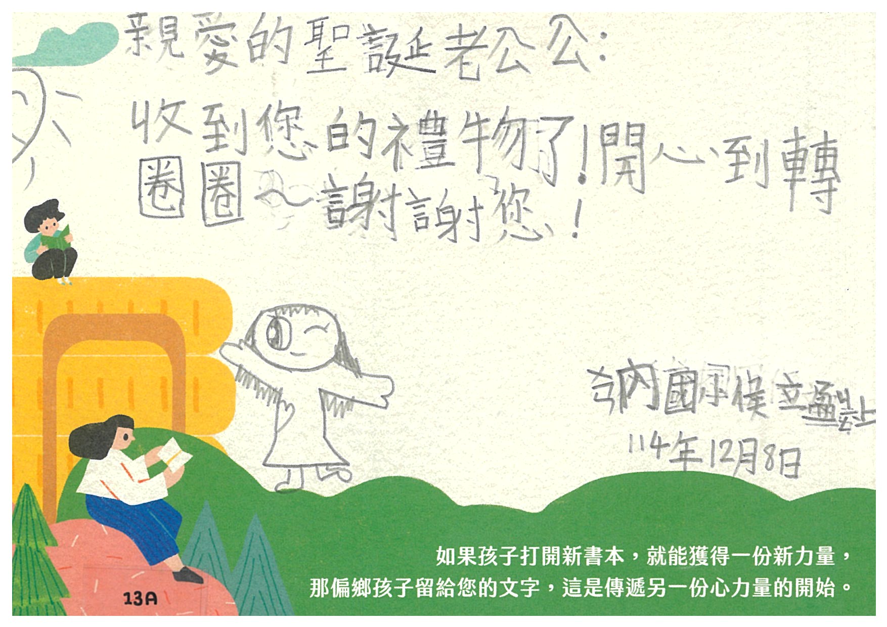 林阿梅 您好:是否已收到孩子寫給您的感謝卡片及我們小小心意的禮物:)