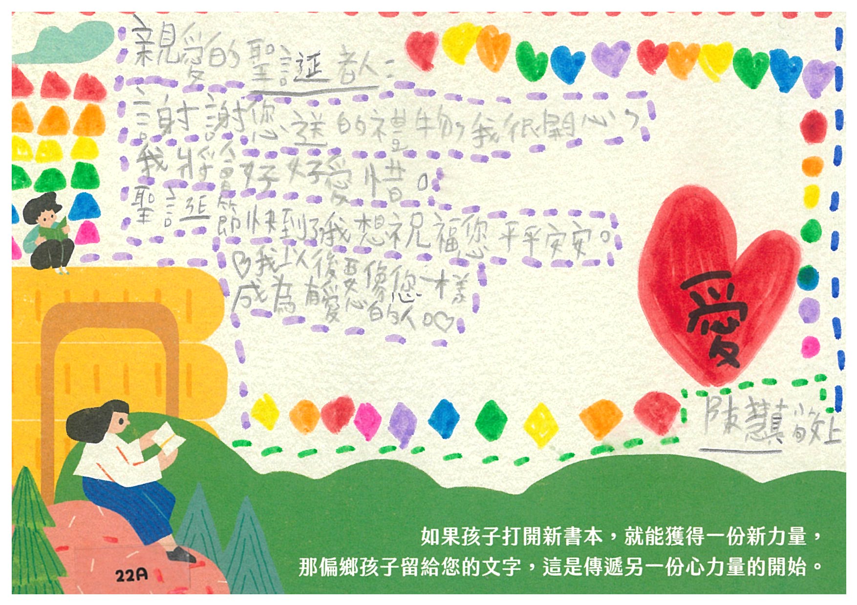 愛祝福:我們收到您精心準備滿滿的可愛文具以及愛閱書籍,感謝您認養孩子的心願書籍,提升小朋友閱讀的能力。孩子們一定會很開心能擁有屬於自己的書籍^^開心再次看到您~