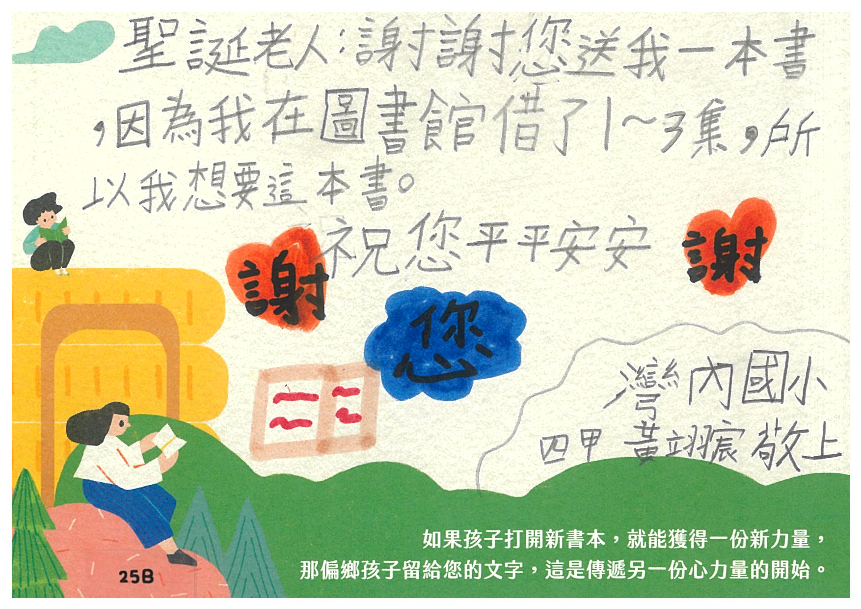 Ting1111:開心再次看到您~收到您精心準備的愛閱書籍,感謝您認養孩子的心願書籍,提升小朋友閱讀的能力。孩子們一定會很開心能擁有屬於自己的書籍^^