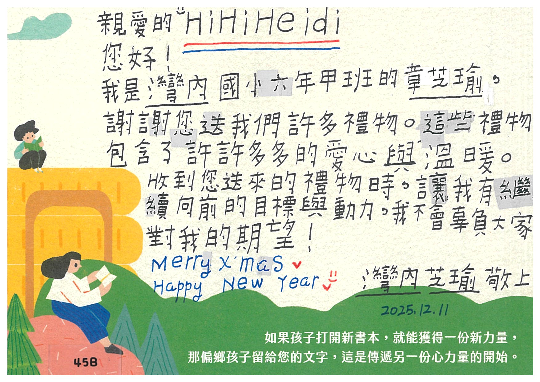 HiHiHeidi:開心再次看到您~已收到您精心準備的愛閱書籍+卡片,感謝您認養孩子的心願書籍,提升小朋友閱讀的能力。孩子們一定會很開心能擁有屬於自己的書籍^^