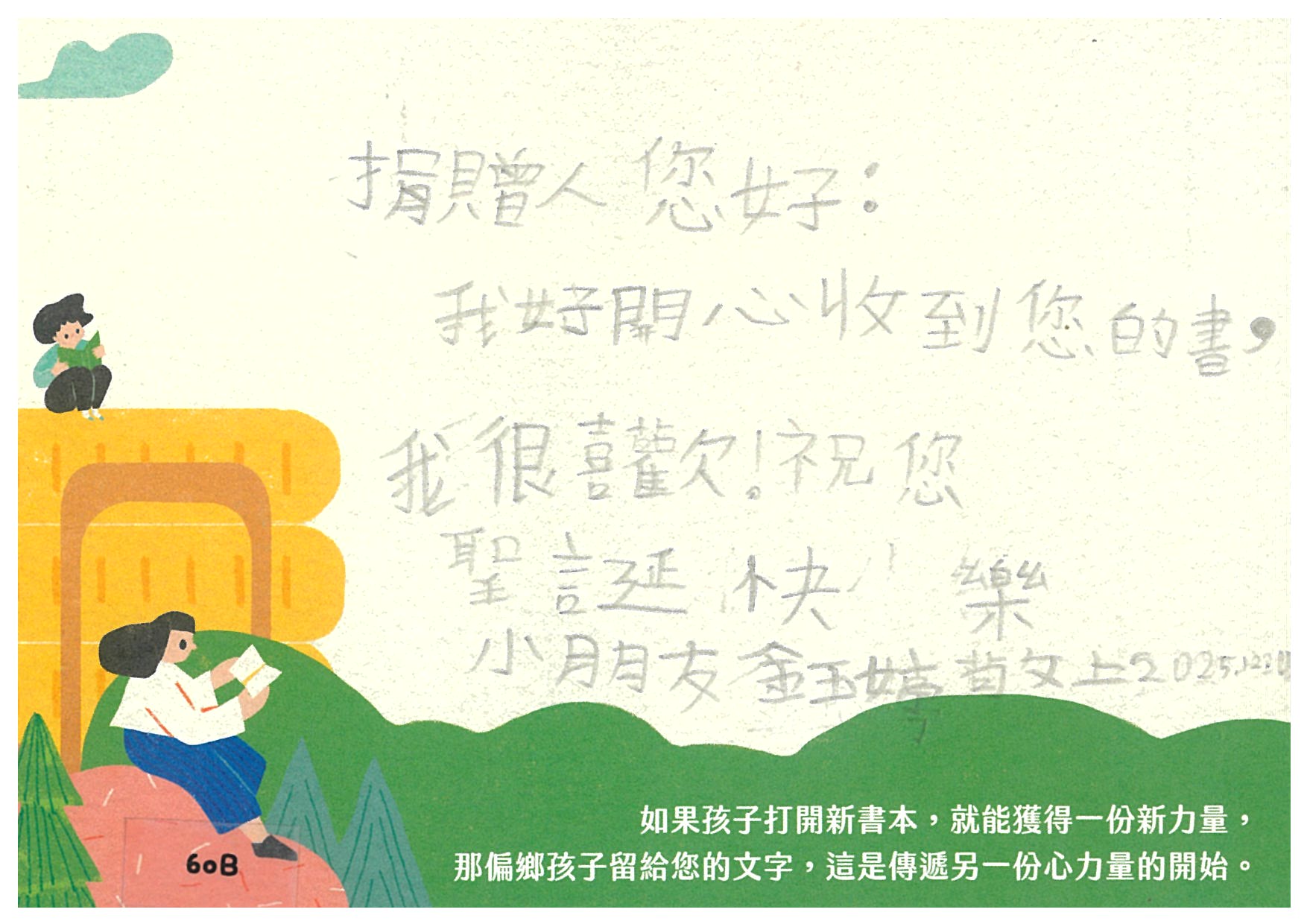 zhirong:開心再次看到您~已收到您準備的愛閱書籍,感謝您認養孩子的心願書籍,提升小朋友閱讀的能力。孩子們一定會很開心能擁有屬於自己的書籍^^