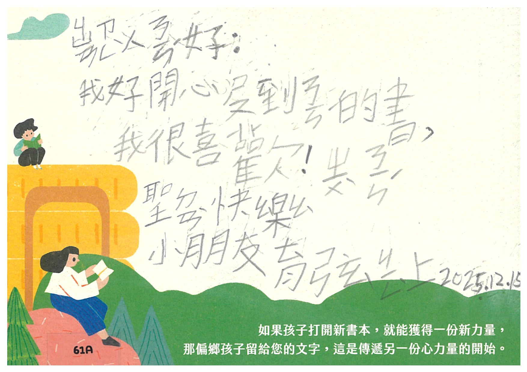 smile999:收到您用心準備的愛閱書籍、文具和卡片。透過愛閱活動,提升小朋友閱讀的能力,且擁有屬於自己的書本。孩子們一定會很開心^^