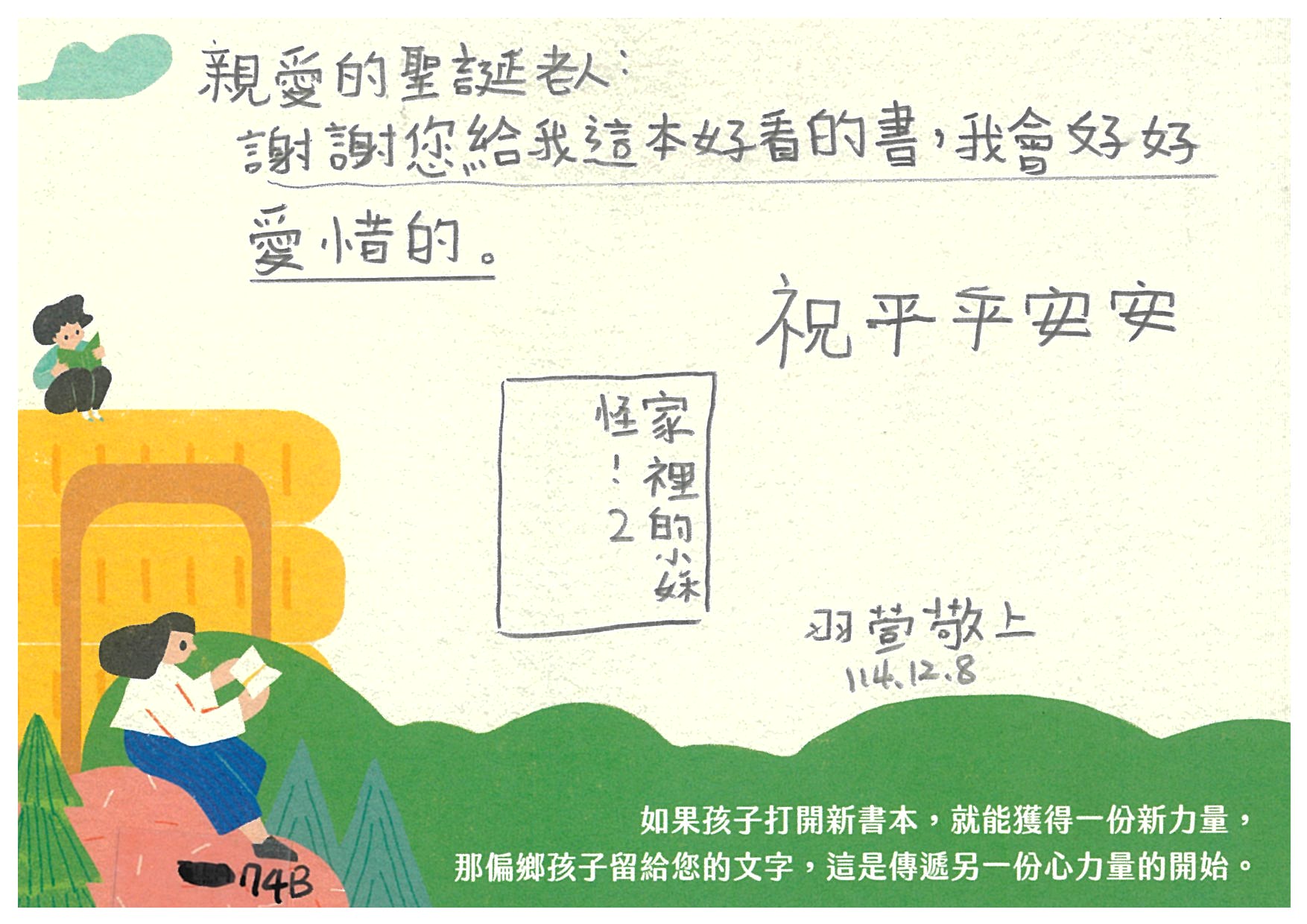 ✪ 11/2(日)後認養的愛閱書籍,請最晚於11/10(一)寄出禮物,以郵戳為憑,逾期之禮物將作為隔年的聖誕禮物物資