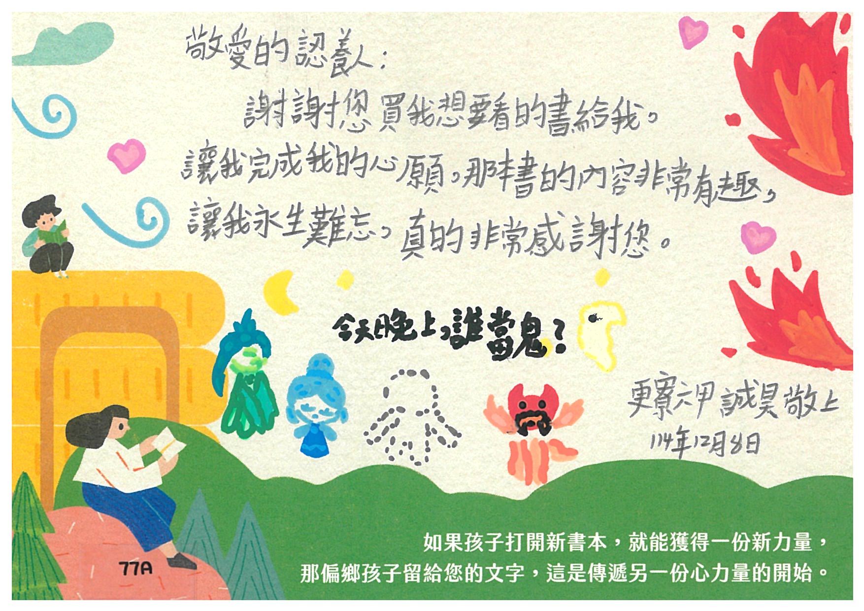 AY安 您好:是否已收到孩子寫給您的感謝卡片及我們小小心意的禮物:)