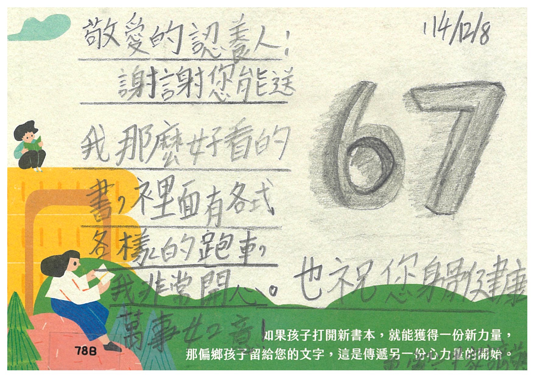 陳wen:謝謝你特地寫給小編們的鼓勵字條,夥伴們深深感受的溫暖。開心再次看到您~已收到您精心準備的愛閱書籍,感謝您認養孩子的心願書籍,提升小朋友閱讀的能力。孩子們一定會很開心能擁有屬於自己的書籍^^