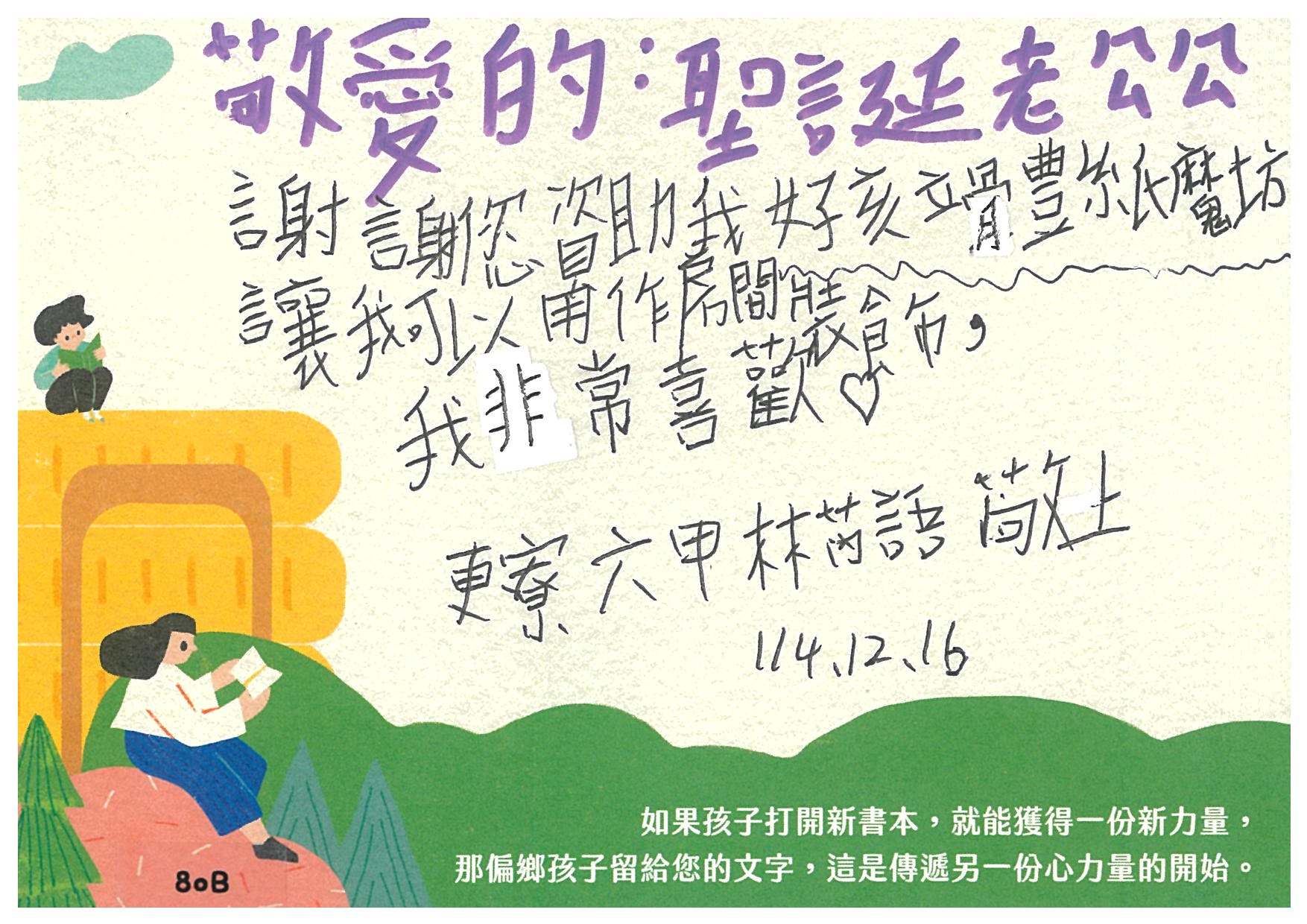 CHIACHIALIN 您好:是否已收到孩子寫給您的感謝卡片及我們小小心意的禮物:)