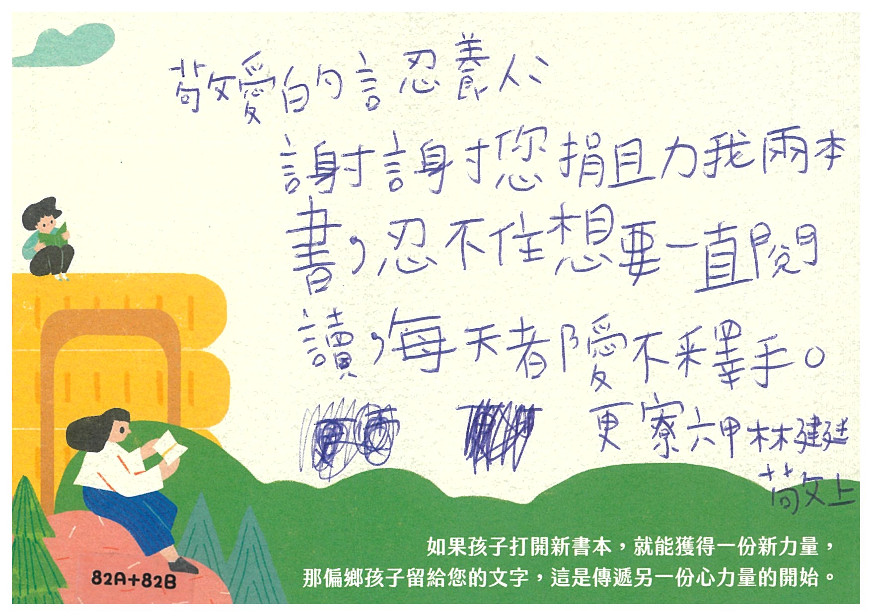 mandykuo77:開心再次看到您~已收到您精心準備的愛閱書籍,感謝您認養孩子的心願書籍,提升小朋友閱讀的能力。孩子們一定會很開心能擁有屬於自己的書籍^^
