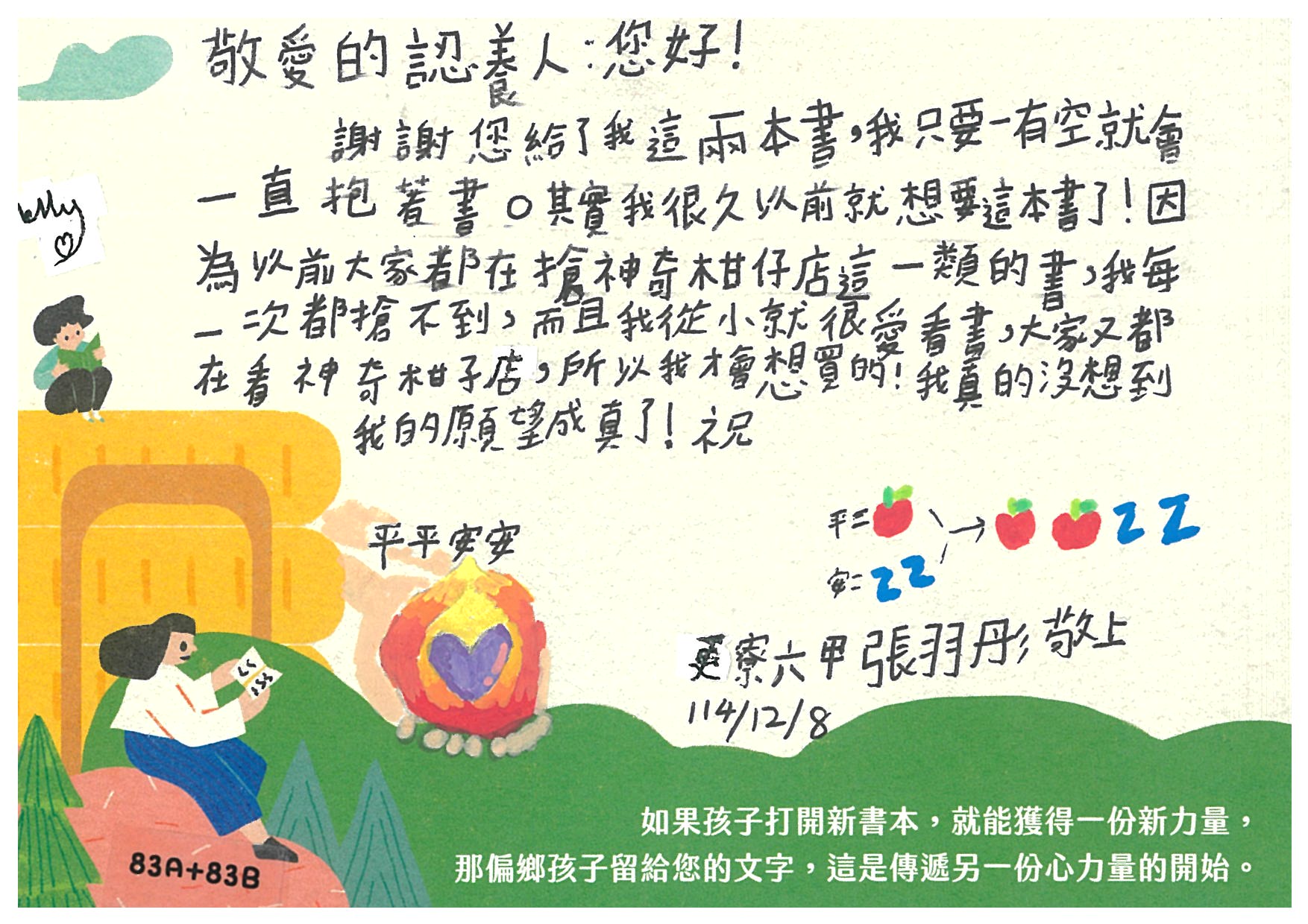 維尼熊熊:開心再次看到您~已收到您精心準備的愛閱書籍,感謝您認養孩子的心願書籍,提升小朋友閱讀的能力。孩子們一定會很開心能擁有屬於自己的書籍^^