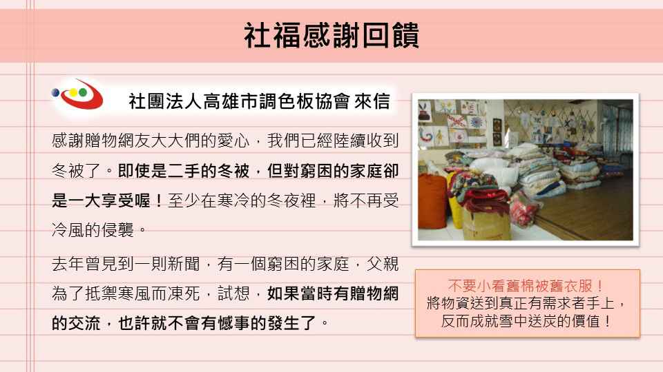 來信署名《高雄調色板協會》,這個機構表示,他們每年冬天都會募集舊冬被(你看!還不要新的)送給獨居老人或街友,但往年都募不滿。沒想到嘗試在贈物網募集,效率奇快、物資品質又好、會員都很有心,社工笑呵呵~因此特別寫信來感謝我們