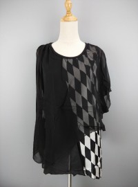 黑色菱形黑白格不規則拼接雪紡圓領無袖上衣