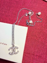 Chanel 閃鑽珍珠Logo項鍊耳環
