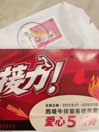 贈友阿伯您好 已收到西堤5折餐券了(郵票還是用可愛的柴柴呢😻)準備帶女兒去吃生日大餐~非常感謝您慷慨贈與,讓孩子可以享受她心心念念的牛排🥰 祝您平安健康、天天開心❤️