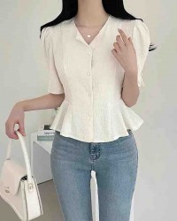 韓國chic設計暗紋提花泡泡袖襯衫