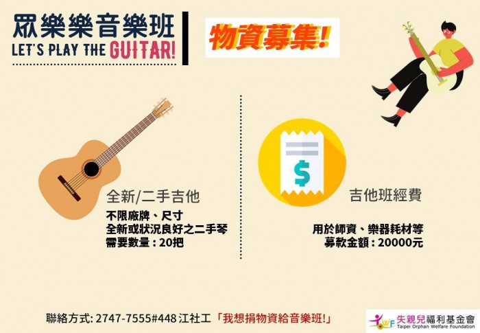 失親兒基金會將於2月份開辦「眾樂樂音樂班」,我們希望以簡易活潑的方式,帶領基金會的孩子進入音樂世界,透過吉他老師和基金會社工的學習陪伴,給予孩子能在音樂中展翅飛翔,創造無限。