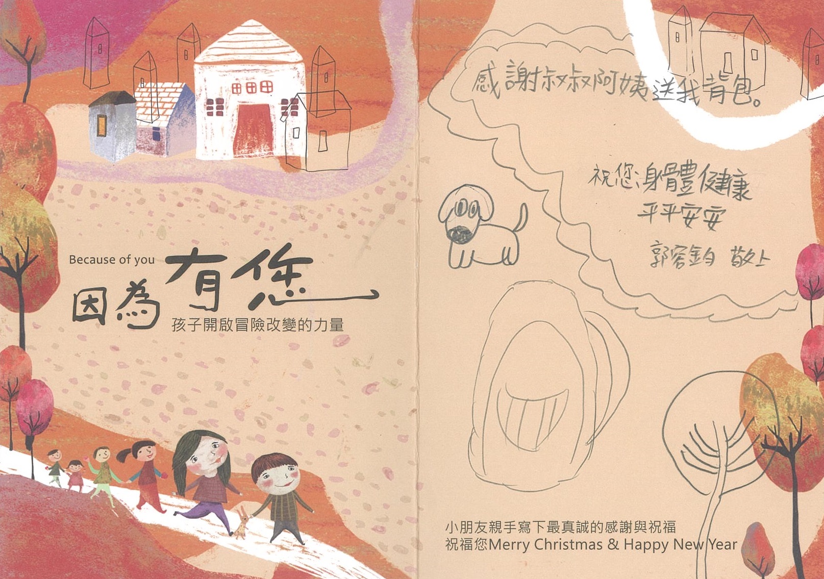 每份聖誕禮物內容:小朋友許下的心願禮物+親手寫下的鼓勵祝福卡片1張