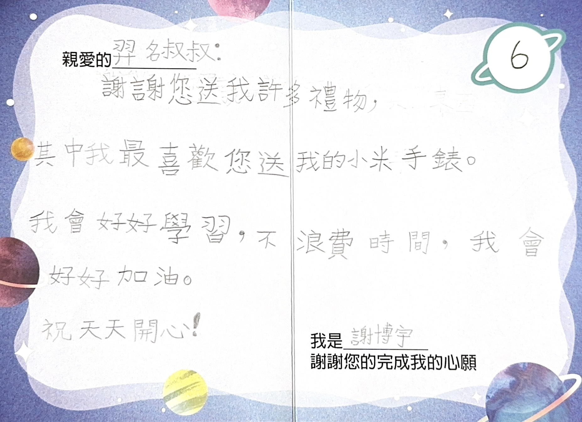 陳羿名:您好,感謝您參與「2023 大聯大愛心.圓夢計畫」活動,已將您的心意,發送到孩子的手上囉!為了將這一切永遠紀錄下來,我們將孩子給您的感謝卡片掃描成圖檔上傳至此,讓您可以回顧這一整個歷程。感謝您的愛心,未來也請您繼續支持大聯大愛心圓夢計畫。