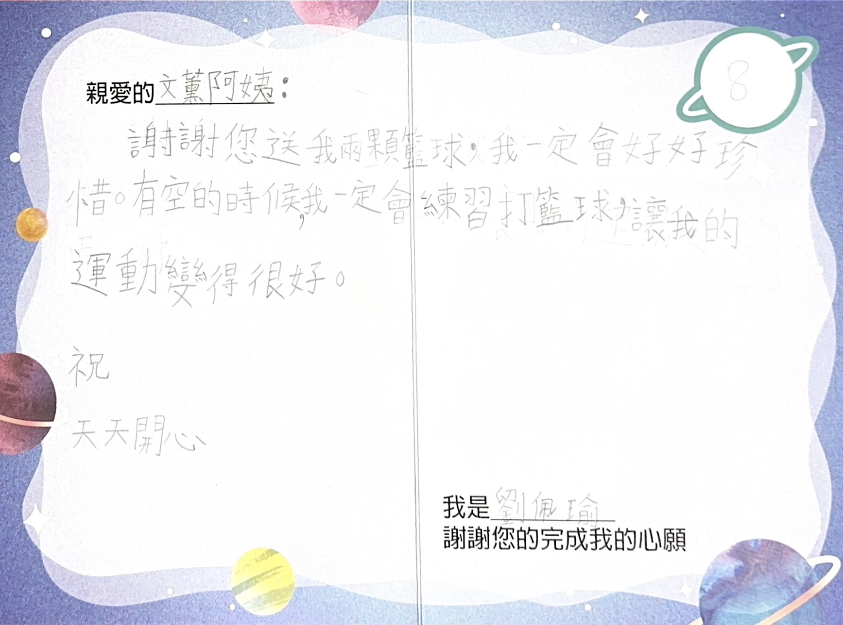 • 備註 佩瑜擅長各種運動,將來的夢想是當小朋友們的運動教練。許下的圓夢禮物是擁有一顆自己的新籃球,這樣就可以隨時帶去公園籃球場打球。