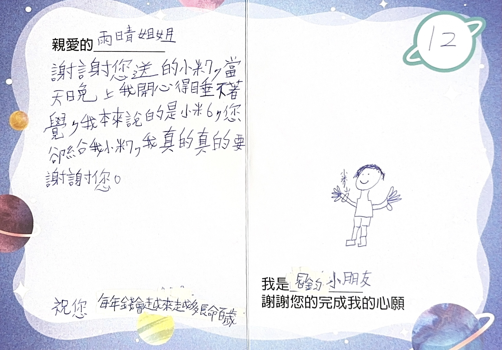 楊羽晴:您好,感謝您參與「2023 大聯大愛心.圓夢計畫」活動,已將您的心意,發送到孩子的手上囉!為了將這一切永遠紀錄下來,我們將孩子給您的感謝卡片掃描成圖檔上傳至此,讓您可以回顧這一整個歷程。感謝您的愛心,未來也請您繼續支持大聯大愛心圓夢計畫。