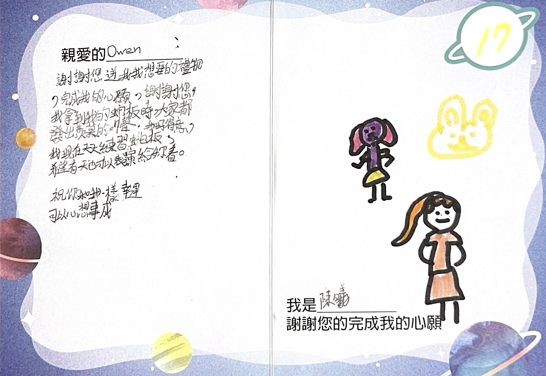 陳志文:您好,感謝您參與「2023 大聯大愛心.圓夢計畫」活動,已將您的心意,發送到孩子的手上囉!為了將這一切永遠紀錄下來,我們將孩子給您的感謝卡片掃描成圖檔上傳至此,讓您可以回顧這一整個歷程。感謝您的愛心,未來也請您繼續支持大聯大愛心圓夢計畫。
