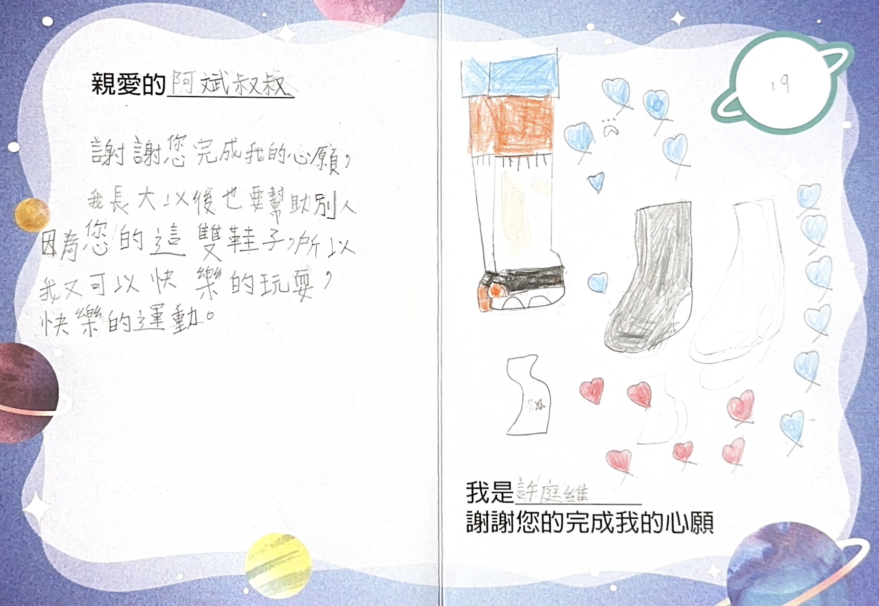 • 備註 愛運動的庭維,未來想當個消防員。他平時最喜歡踢足球和打籃球,希望獲得一雙舒適的黑色運動鞋,讓他可以做各式各樣的運動。