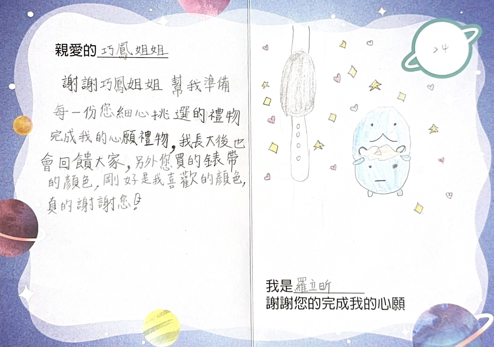 黃巧鳳:您好,感謝您參與「2023 大聯大愛心.圓夢計畫」活動,已將您的心意,發送到孩子的手上囉!為了將這一切永遠紀錄下來,我們將孩子給您的感謝卡片掃描成圖檔上傳至此,讓您可以回顧這一整個歷程。感謝您的愛心,未來也請您繼續支持大聯大愛心圓夢計畫。