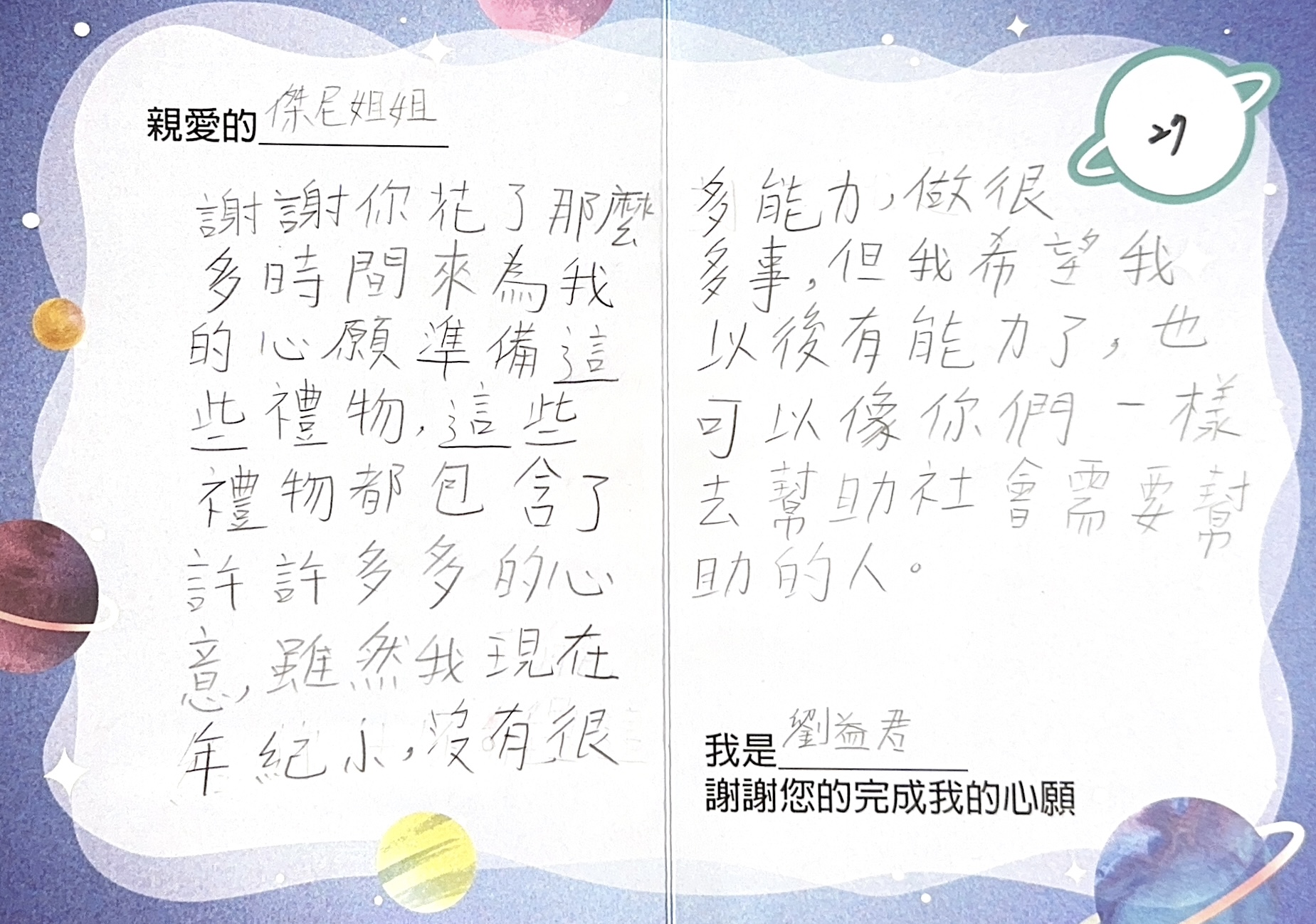 董珈吟:您好,感謝您參與「2023 大聯大愛心.圓夢計畫」活動,已將您的心意,發送到孩子的手上囉!為了將這一切永遠紀錄下來,我們將孩子給您的感謝卡片掃描成圖檔上傳至此,讓您可以回顧這一整個歷程。感謝您的愛心,未來也請您繼續支持大聯大愛心圓夢計畫。