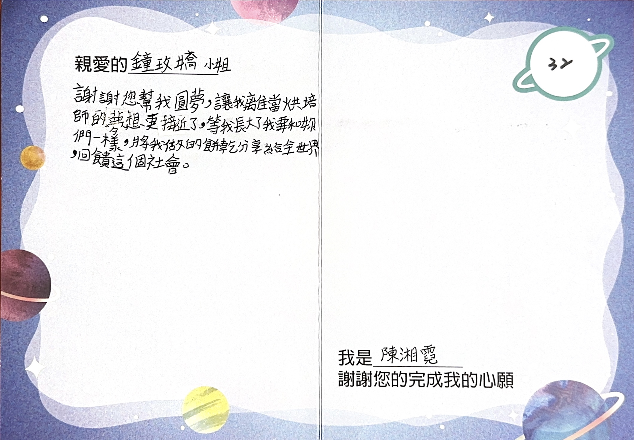 鍾玫嬌:您好,感謝您參與「2023 大聯大愛心.圓夢計畫」活動,已將您的心意,發送到孩子的手上囉!為了將這一切永遠紀錄下來,我們將孩子給您的感謝卡片掃描成圖檔上傳至此,讓您可以回顧這一整個歷程。感謝您的愛心,未來也請您繼續支持大聯大愛心圓夢計畫。