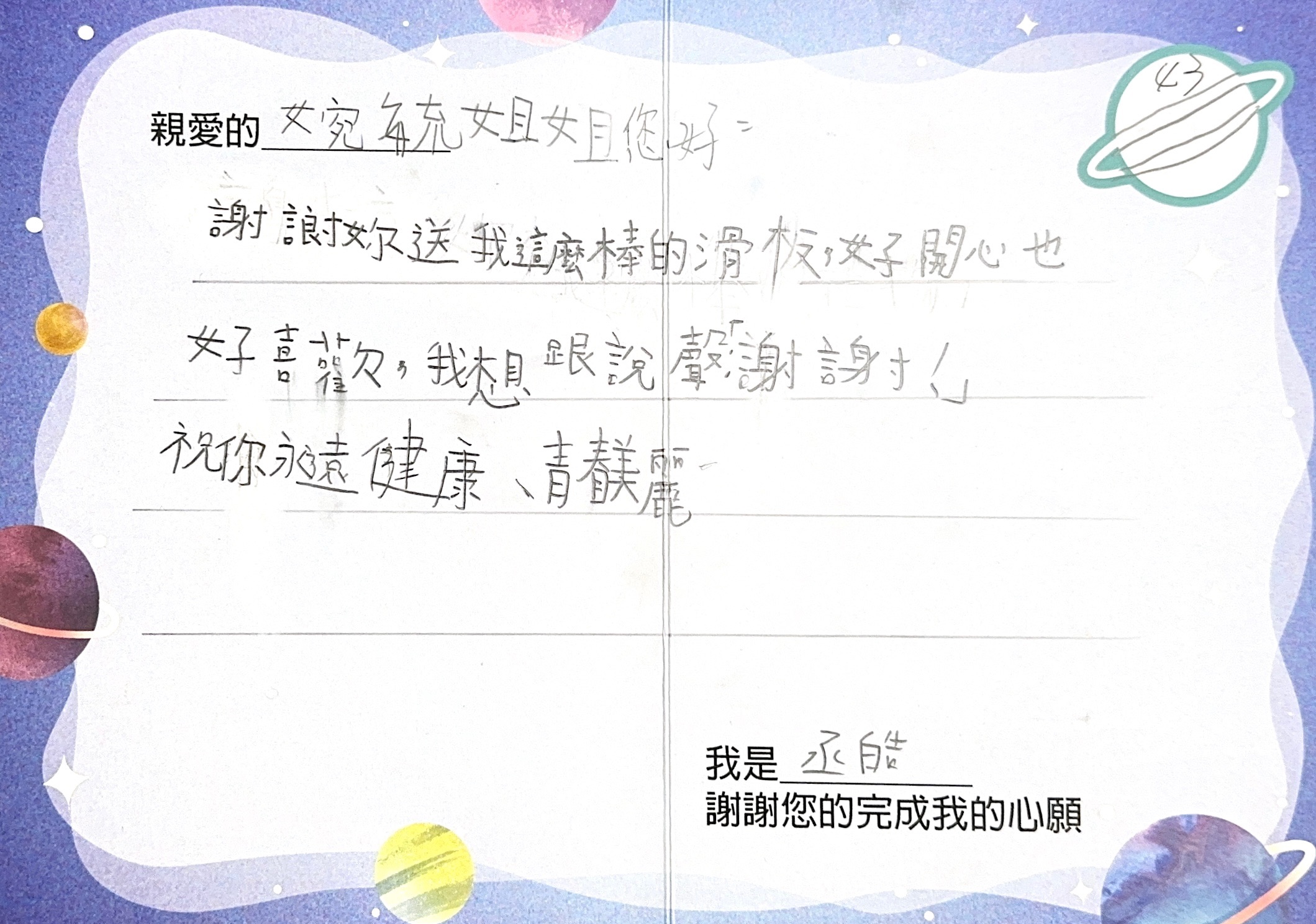 李婉毓:您好,感謝您參與「2023 大聯大愛心.圓夢計畫」活動,已將您的心意,發送到孩子的手上囉!為了將這一切永遠紀錄下來,我們將孩子給您的感謝卡片掃描成圖檔上傳至此,讓您可以回顧這一整個歷程。感謝您的愛心,未來也請您繼續支持大聯大愛心圓夢計畫。