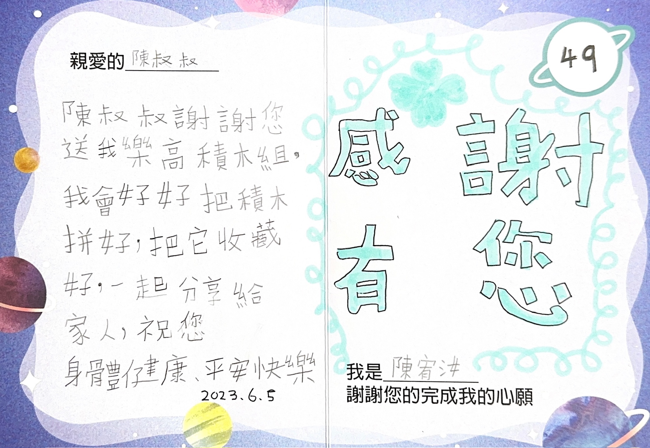 陳志霖:您好,感謝您參與「2023 大聯大愛心.圓夢計畫」活動,已將您的心意,發送到孩子的手上囉!為了將這一切永遠紀錄下來,我們將孩子給您的感謝卡片掃描成圖檔上傳至此,讓您可以回顧這一整個歷程。感謝您的愛心,未來也請您繼續支持大聯大愛心圓夢計畫。