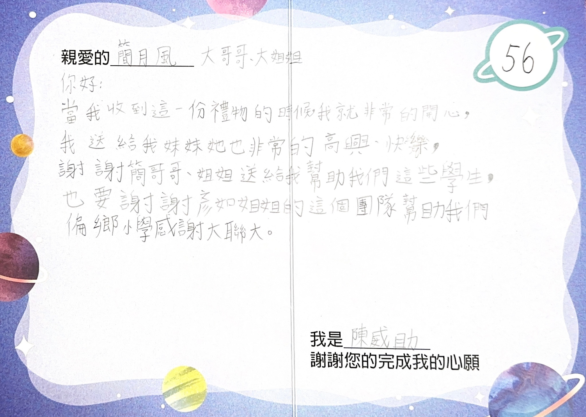 簡月風:您好,感謝您參與「2023 大聯大愛心.圓夢計畫」活動,已將您的心意,發送到孩子的手上囉!為了將這一切永遠紀錄下來,我們將孩子給您的感謝卡片掃描成圖檔上傳至此,讓您可以回顧這一整個歷程。感謝您的愛心,未來也請您繼續支持大聯大愛心圓夢計畫。