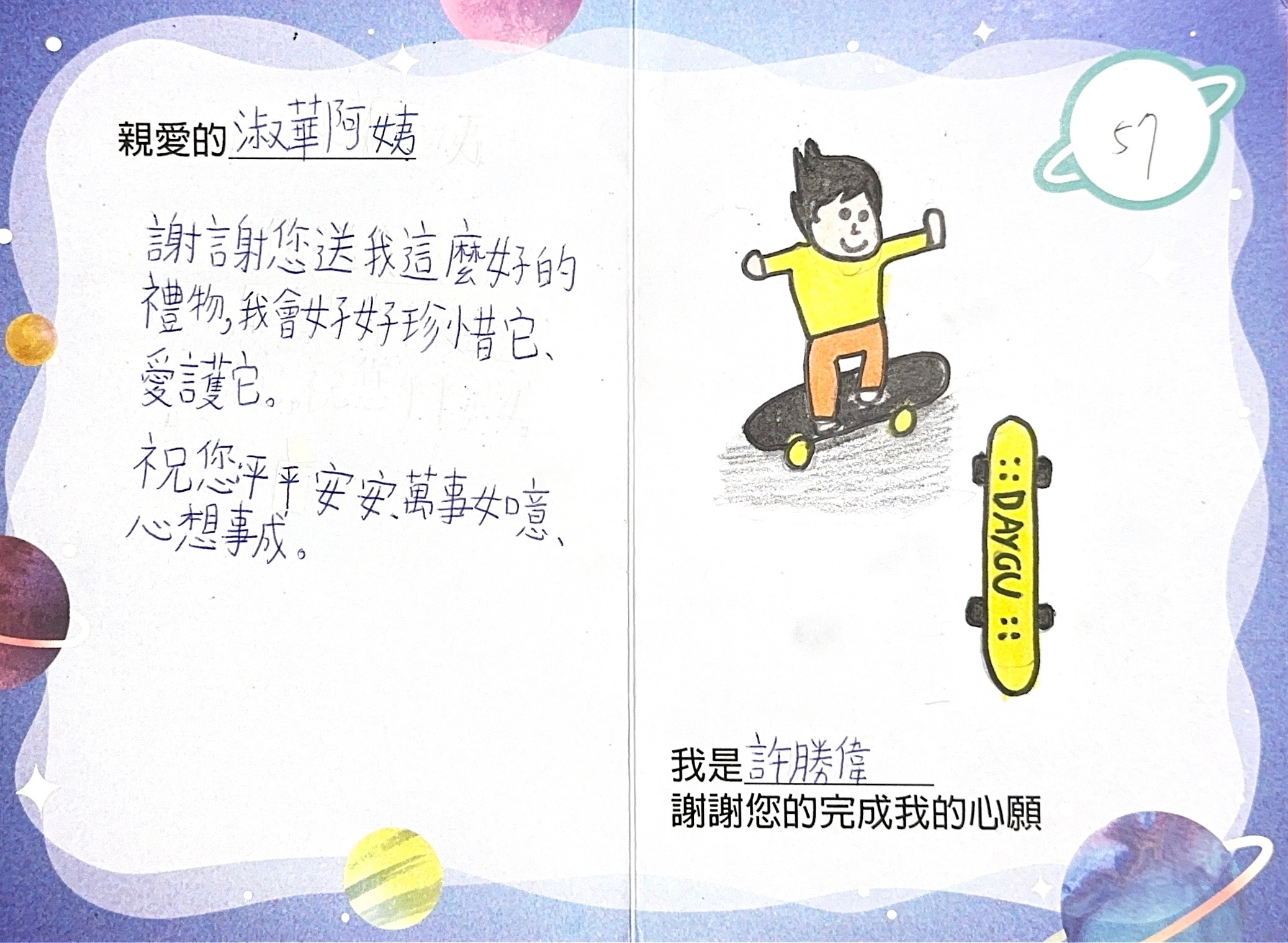 陳淑華:您好,感謝您參與「2023 大聯大愛心.圓夢計畫」活動,已將您的心意,發送到孩子的手上囉!為了將這一切永遠紀錄下來,我們將孩子給您的感謝卡片掃描成圖檔上傳至此,讓您可以回顧這一整個歷程。感謝您的愛心,未來也請您繼續支持大聯大愛心圓夢計畫。