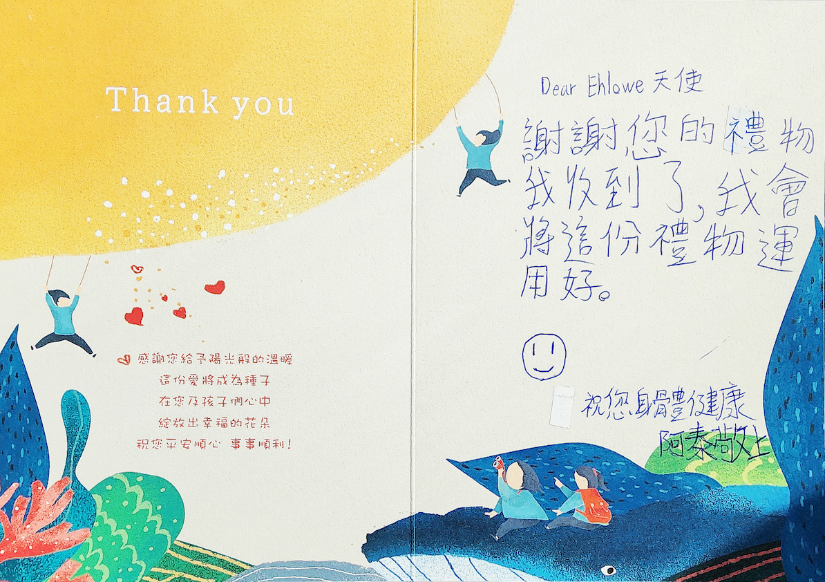 3.禮物於年底前,舉辦活動發放給孩子們,孩子們也將親手寫下感謝卡片,感謝愛心認領者。