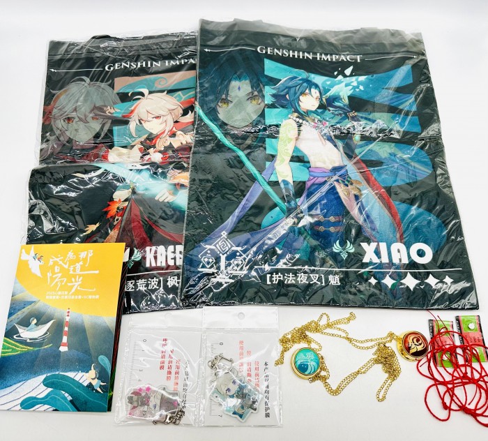 原神懷錶(火、風)、原神鑰匙扣(林尼+琳妮特一組)、原神帆布包(魈、萬葉)