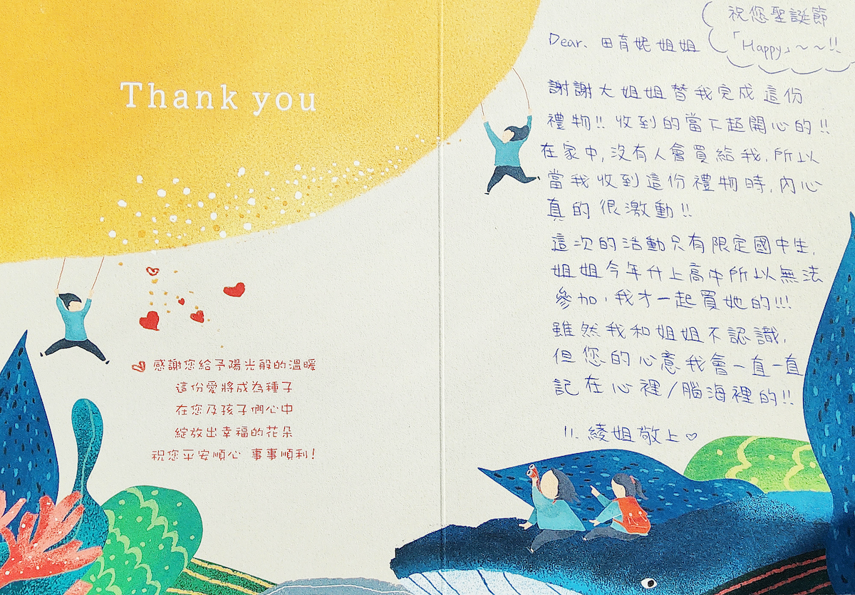 3.禮物於年底前,舉辦活動發放給孩子們,孩子們也將親手寫下感謝卡片,感謝愛心認領者。