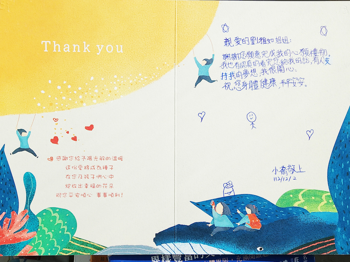 Dear 劉雅如:您好,感謝您參與「2023聚陽實業x失親兒基金會」心願活動,已將您的心意,發送到孩子的手上囉!為了將這一切永遠紀錄下來,我們將孩子給您的感謝卡片掃描成圖檔上傳至此,讓您可以回顧這一整個歷程。感謝您的愛心,未來也請繼續支持聚陽實業心願活動。如有疑問,請聯繫永續發展部-Tina#1152/Allie#1156。