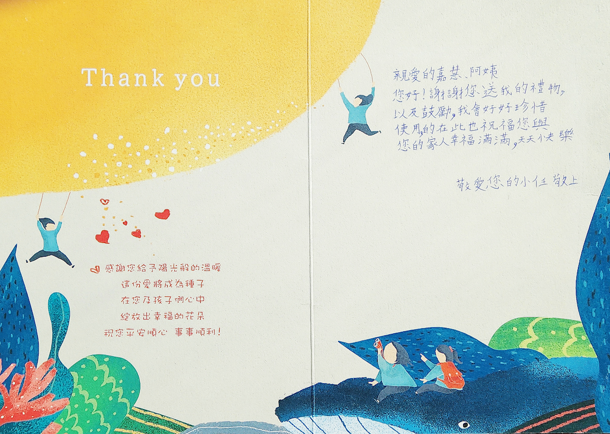 Dear 林小慧:您好,感謝您參與「2023聚陽實業x失親兒基金會」心願活動,已將您的心意,發送到孩子的手上囉!為了將這一切永遠紀錄下來,我們將孩子給您的感謝卡片掃描成圖檔上傳至此,讓您可以回顧這一整個歷程。感謝您的愛心,未來也請繼續支持聚陽實業心願活動。如有疑問,請聯繫永續發展部-Tina#1152/Allie#1156。