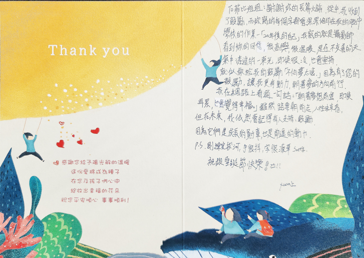3.禮物於年底前,舉辦活動發放給孩子們,孩子們也將親手寫下感謝卡片,感謝愛心認領者。