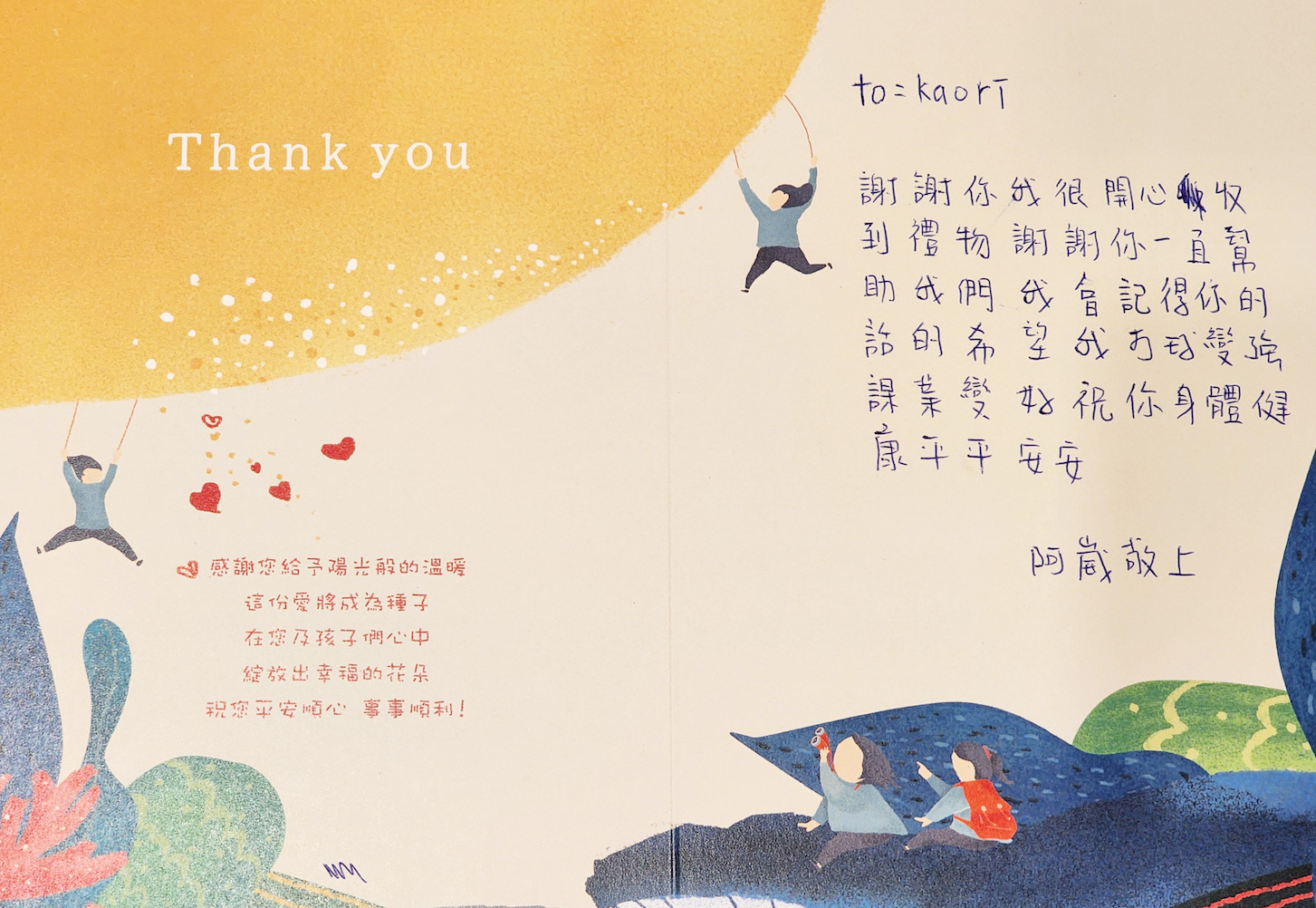 Dear 汪昭熒:您好,感謝您參與「2023聚陽實業x失親兒基金會」心願活動,已將您的心意,發送到孩子的手上囉!為了將這一切永遠紀錄下來,我們將孩子給您的感謝卡片掃描成圖檔上傳至此,讓您可以回顧這一整個歷程。感謝您的愛心,未來也請繼續支持聚陽實業心願活動。如有疑問,請聯繫永續發展部-Tina#1152/Allie#1156。