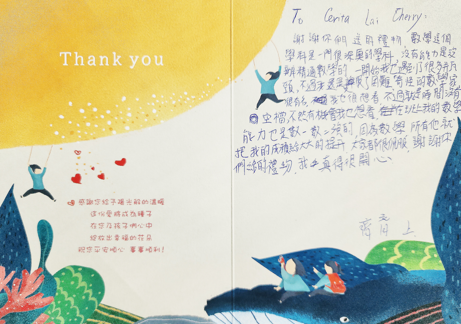 Dear Cerita Lai 賴若琦:您好,感謝您參與「2023聚陽實業x失親兒基金會」心願活動,已將您的心意,發送到孩子的手上囉!為了將這一切永遠紀錄下來,我們將孩子給您的感謝卡片掃描成圖檔上傳至此,讓您可以回顧這一整個歷程。感謝您的愛心,未來也請繼續支持聚陽實業心願活動。如有疑問,請聯繫永續發展部-Tina#1152/Allie#1156。