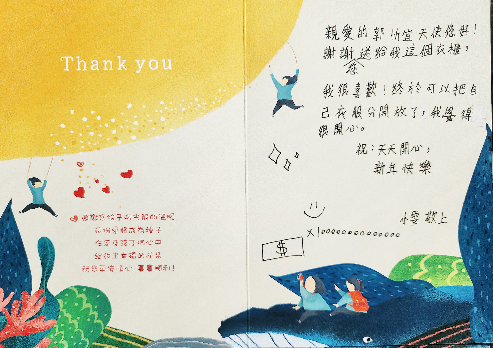 Dear 郭忻宜:您好,感謝您參與「2023聚陽實業x失親兒基金會」心願活動,已將您的心意,發送到孩子的手上囉!為了將這一切永遠紀錄下來,我們將孩子給您的感謝卡片掃描成圖檔上傳至此,讓您可以回顧這一整個歷程。感謝您的愛心,未來也請繼續支持聚陽實業心願活動。如有疑問,請聯繫永續發展部-Tina#1152/Allie#1156。