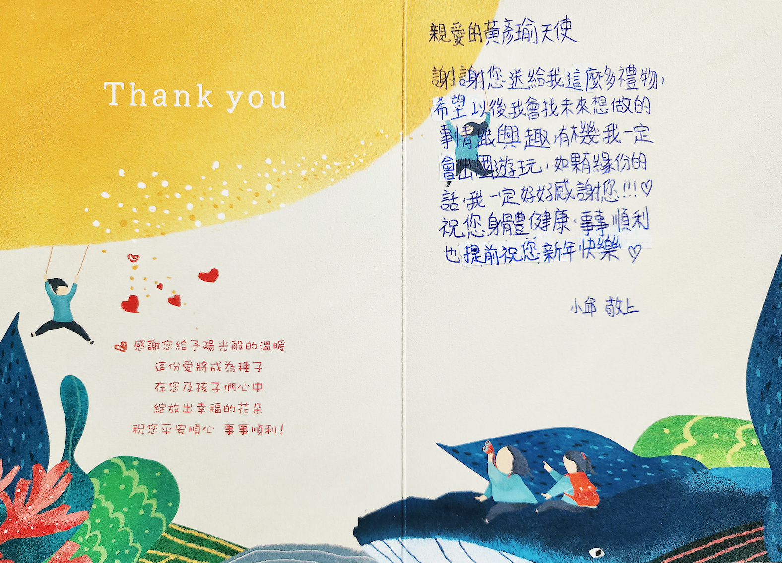 Dear 黃彥瑜:您好,感謝您參與「2023聚陽實業x失親兒基金會」心願活動,已將您的心意,發送到孩子的手上囉!為了將這一切永遠紀錄下來,我們將孩子給您的感謝卡片掃描成圖檔上傳至此,讓您可以回顧這一整個歷程。感謝您的愛心,未來也請繼續支持聚陽實業心願活動。如有疑問,請聯繫永續發展部-Tina#1152/Allie#1156。