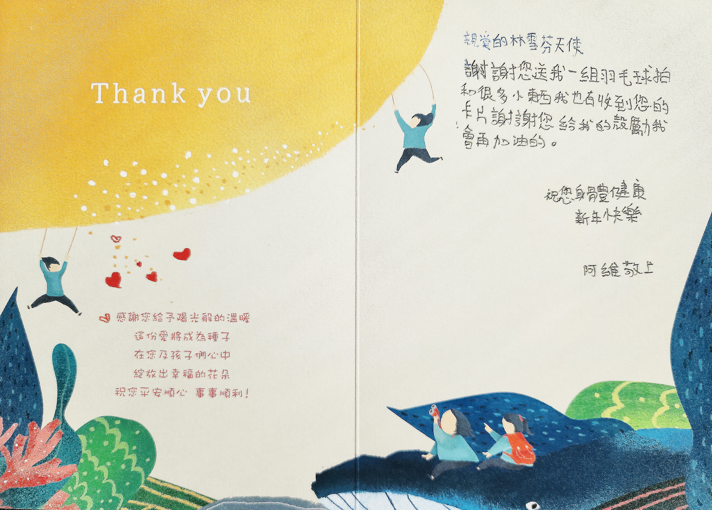 Dear 林雪芬:您好,感謝您參與「2023聚陽實業x失親兒基金會」心願活動,已將您的心意,發送到孩子的手上囉!為了將這一切永遠紀錄下來,我們將孩子給您的感謝卡片掃描成圖檔上傳至此,讓您可以回顧這一整個歷程。感謝您的愛心,未來也請繼續支持聚陽實業心願活動。如有疑問,請聯繫永續發展部-Tina#1152/Allie#1156。