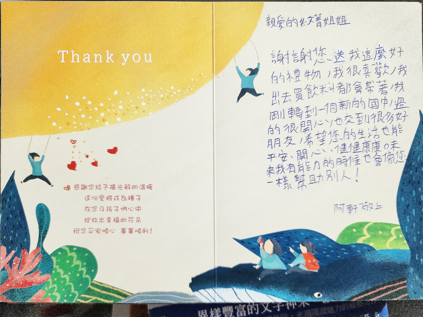 Dear 張紋菁:您好,感謝您參與「2023聚陽實業x失親兒基金會」心願活動,已將您的心意,發送到孩子的手上囉!為了將這一切永遠紀錄下來,我們將孩子給您的感謝卡片掃描成圖檔上傳至此,讓您可以回顧這一整個歷程。感謝您的愛心,未來也請繼續支持聚陽實業心願活動。如有疑問,請聯繫永續發展部-Tina#1152/Allie#1156。
