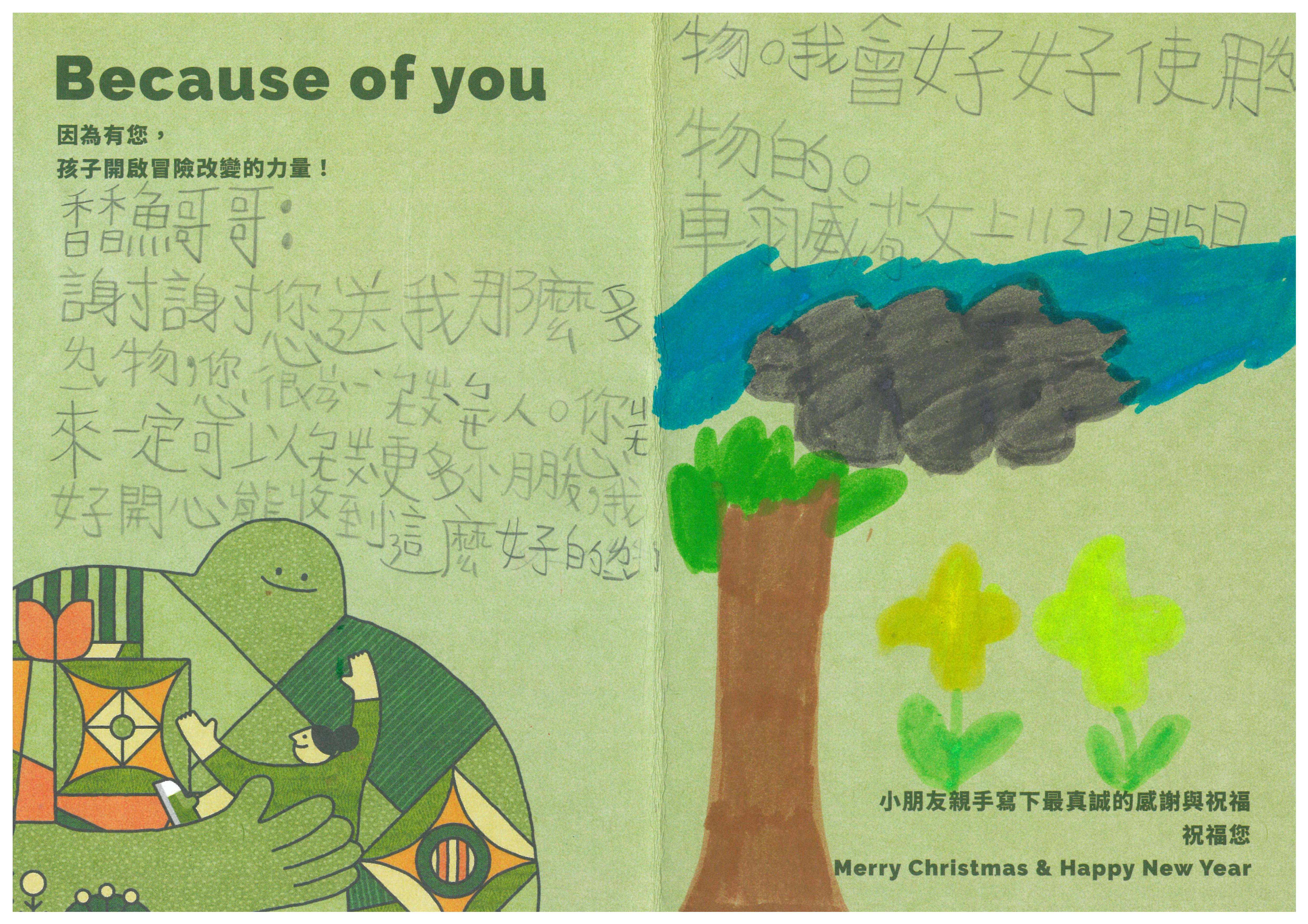 每份聖誕禮物內容:小朋友許下的心願禮物+親手寫下的鼓勵祝福卡片1張